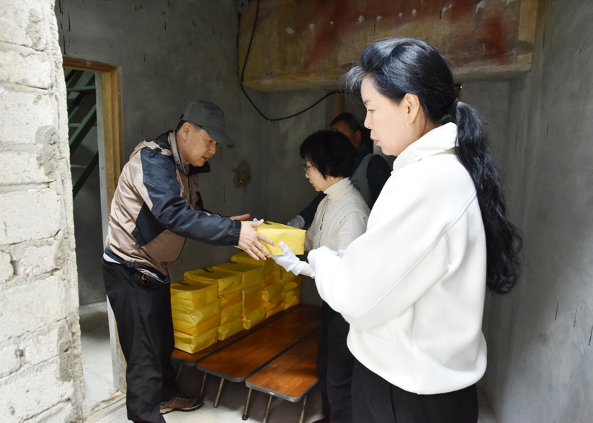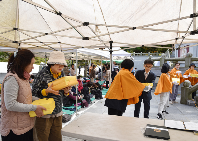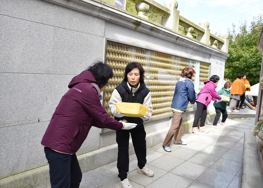 경건한 마음으로 한권한권 줄지어서 건네받으며 부처님 몸안에 봉인 하였다.